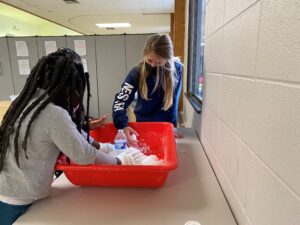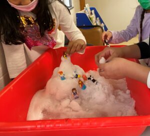 First, students constructed a funnel with paper to assist them as they precariously poured baking soda into an empty water bottle and then added about a teaspoon of dish soap. Next, students worked together to pack snow into the shape of a volcano and placed their water bottle in the center of the volcano- all in a self-contained shallow bucket- don’t worry. Some groups chose to build little towns of Legos wedged into the sides of their volcano, with only a hunch of the danger soon to follow. Once construction finished, they poured the vinegar into the water bottle and watched the chemical reaction occur as “lava” bubbles erupted out of the volcano, burying their small Lego towns.